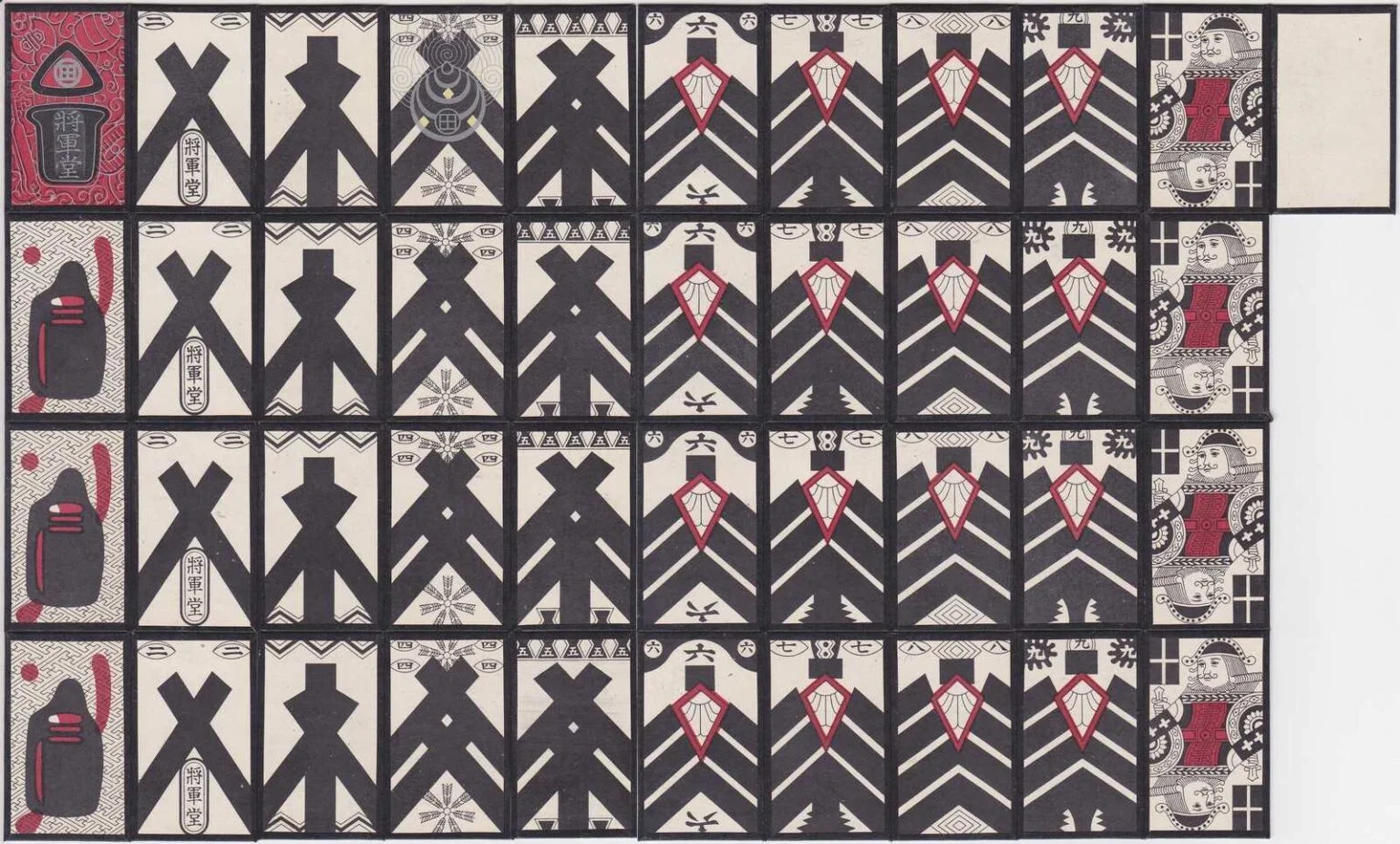 This deck is separated into 4 sets of identical 1-10 number cards. They also feature a progressively involved pattern where 1 is a basic pattern and 9 being an advanced version; 10 depicts an image similar to a king in the western deck.