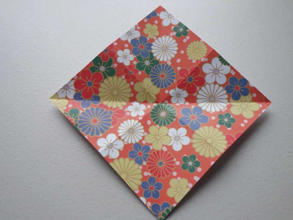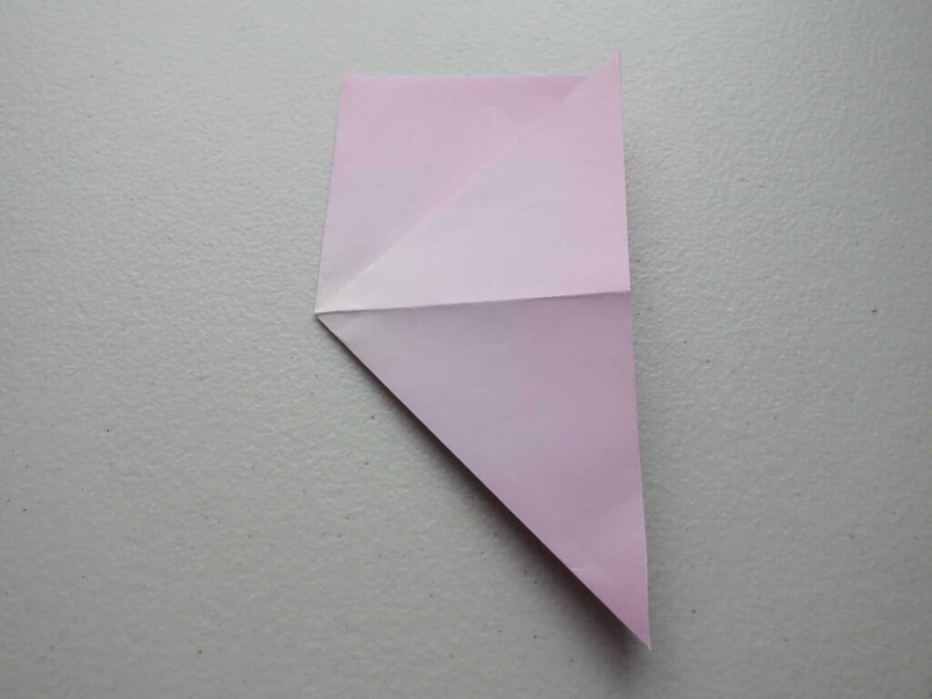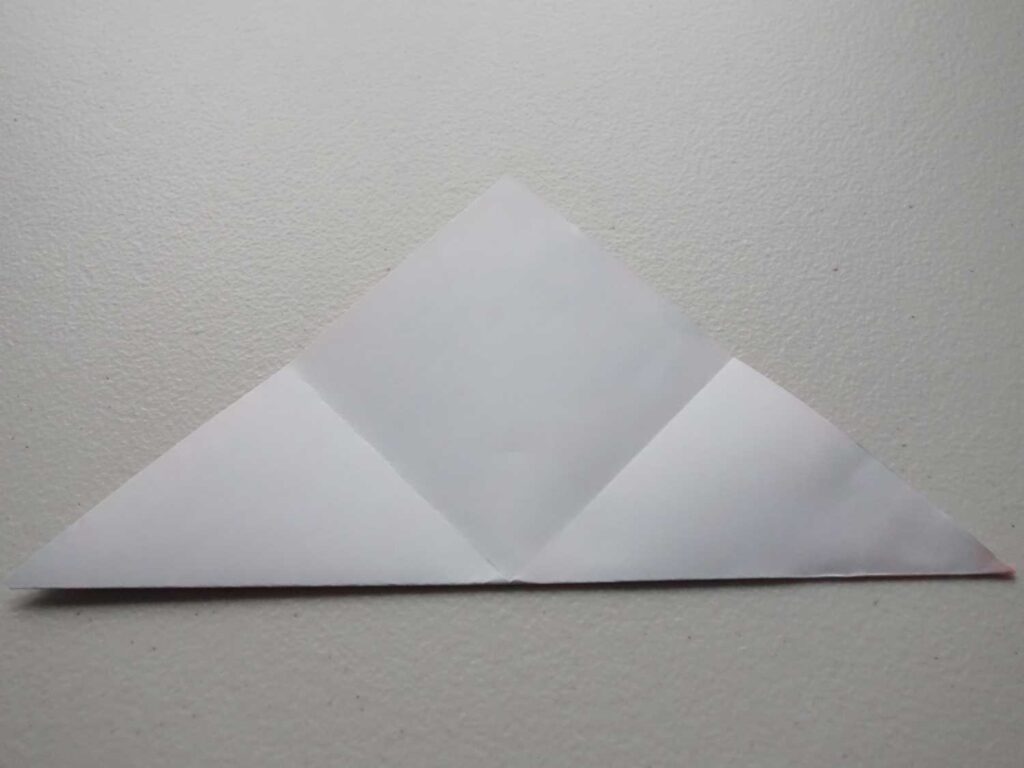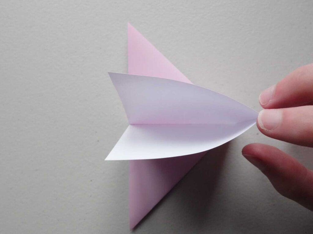 A mountain fold is opposite to a valley fold. Lift the sheet of paper into the air, take an edge and fold downwards. This creates a peak or ‘mountain’.